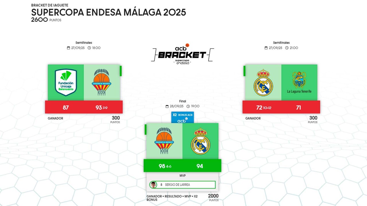 La final de la Supercopa Endesa 2025, conquistada por el Valencia Basket frente al Real Madrid provocó que solo un 9,1% de los usuarios que completaron el Bracket acertaran el resultado de la final.